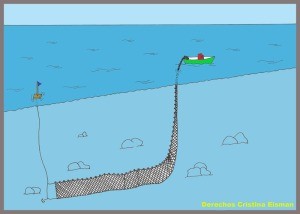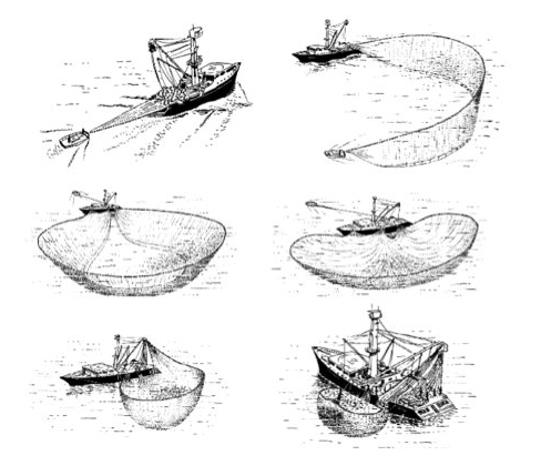 Se utiliza  una gran bolsa de red abierta que se arrastra por el fondo marino con el fin de recoger los peces.