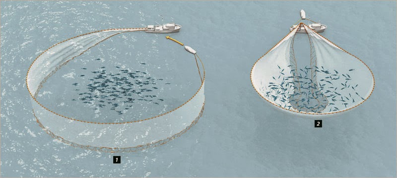 Se trata de rodear un banco de peces con una gran red, de entre 250 y 1000 metros de longitud y unos 40 metros de profundidad, que se mantiene flotando en posición vertical. Al paso de los peces, se cierra por la parte inferior y estos quedan atrapados.