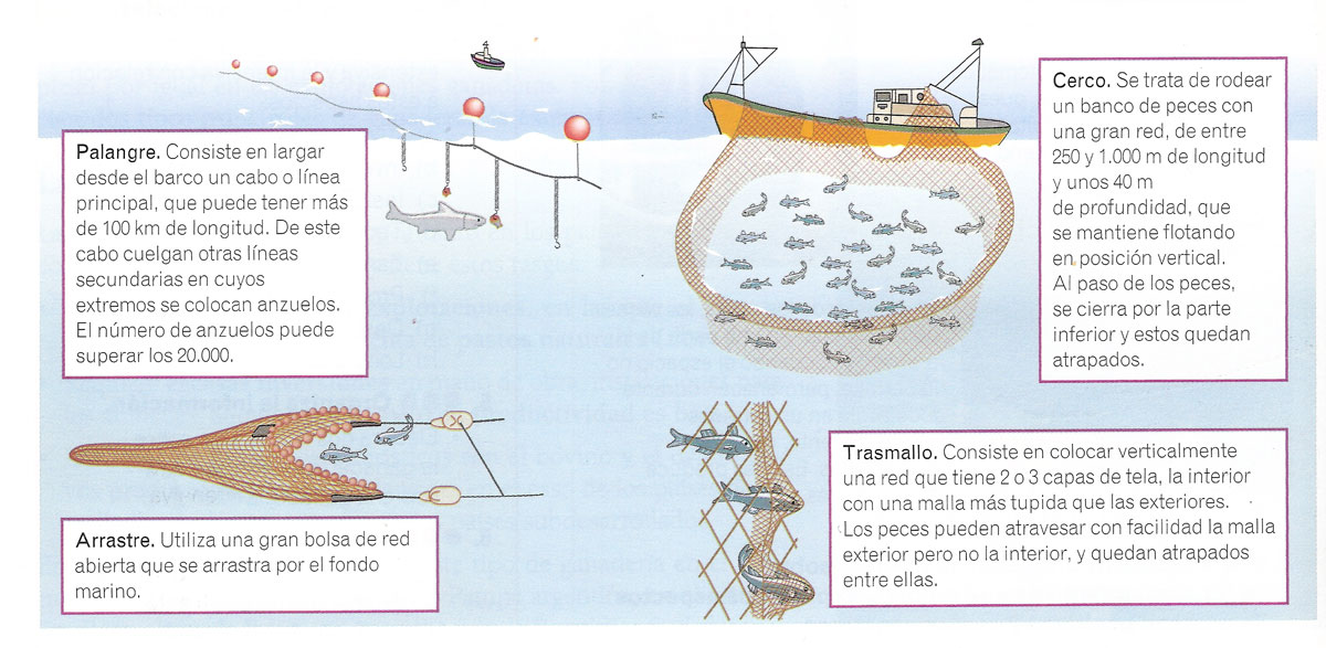 Pesca de bajura: Tiene lugar en la zona de las 12 millas. Implica una pesca marítima a bordo y, por lo tanto, no incluye ni la pesca a pie ni la pesca submarina.