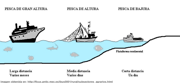 Pesca de gran altura: La pesca de gran altura es aquella que se realiza en las zonas más alejadas de los continentes, en aguas oceánicas. Sus campañas se extienden durante meses, pudiendo seguir a los grandes bancos de peces por las aguas de medio mundo.