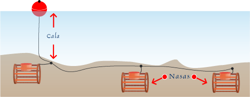 Para todo tipo de nasas deben ser caladas de forma que constituyan caceas, trenes o tandas, en las que cada nasa se empata a una tralla y esta, a su vez, se une al cabo madre.